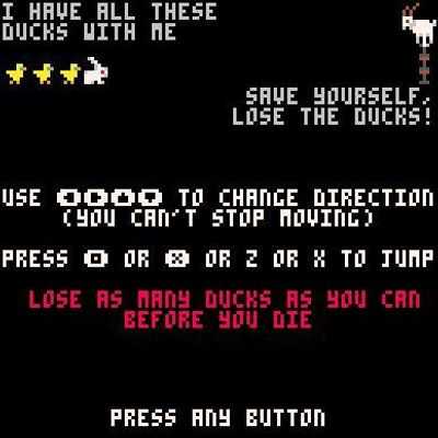 Управление: используйте клавиши со стрелками, чтобы менять направление, и Z или X, чтобы перепрыгивать через бомбы и монстров. Цель — потерять всех уток!