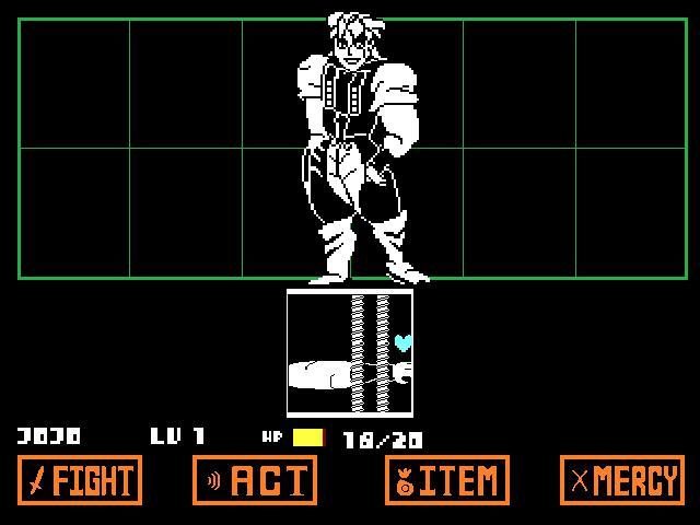 Постоянная попытка украсть художественные материалы из Undertale и пересобрать движок с нуля для развлечения. Решил использовать «Невероятные приключения Джоджо» в качестве исходного материала, потому что мне нравится JJBA, и я думаю, что если мне не разрешат монетизировать его, несмотря ни на что, я могу сделать что-нибудь веселое, понимаете?