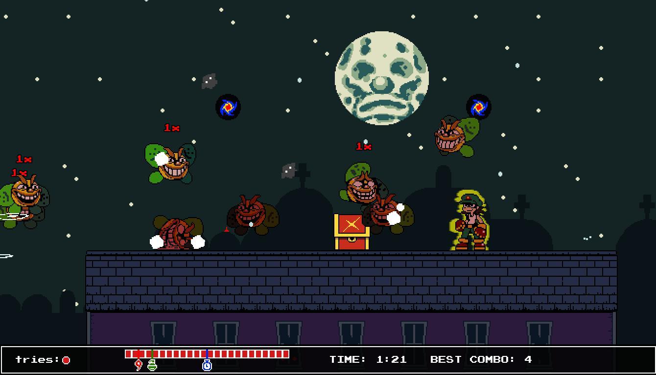 Knock 'em Out – это игра, сочетающая платформенный файтинг (вспомните Super Smash Bros) и beat-em-up. Вместо того, чтобы наносить урон врагам, удары по ним отбрасывают их назад, и чем больше вы их бьете, тем дальше они будут летать! Вам предстоит бить кулаками, пинать, жонглировать и швырять различных неприятных клоунов с множества уникальных арен. У персонажа игрока есть более 20 уникальных движений на выбор, от простых ударов руками и ногами до струй огня, гранат и даже замедления времени!
