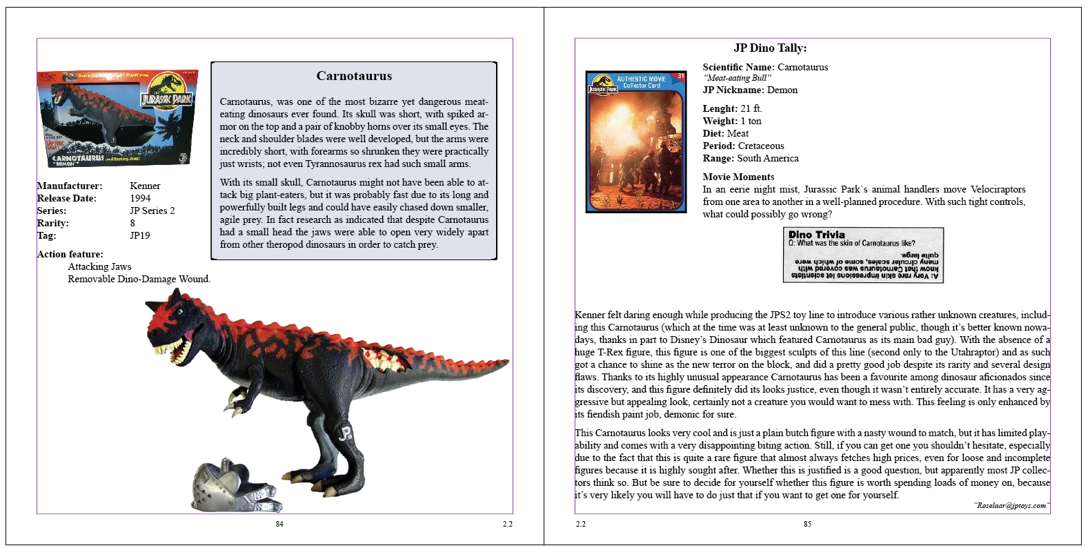Эта книга предназначена для тех, кто интересуется игрушками из Парка Юрского периода и является коллекционером игрушек Кеннера. В книгу вошли фигурки первых двух лет, выпущенные вместе с первым фильмом «Парк Юрского периода».