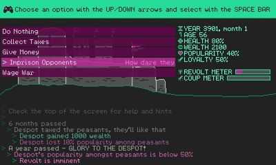 Игра для Ludum Dare 39 на тему «На исходе сил». Вы играете за деспота, власть которого ослабевает, и цель состоит в том, чтобы накопить как можно больше богатства и выжить как можно дольше.