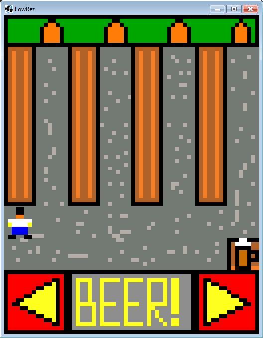 Это простой клон "Tapper" из аркадных систем. Вы официант, ваша задача взять пиво со стола и поставить его на надлежащую пивную «дорожку» для жаждущих клиентов. Если вы разобьете 3 пива или клиент до вас доберется - вы потеряетесь.