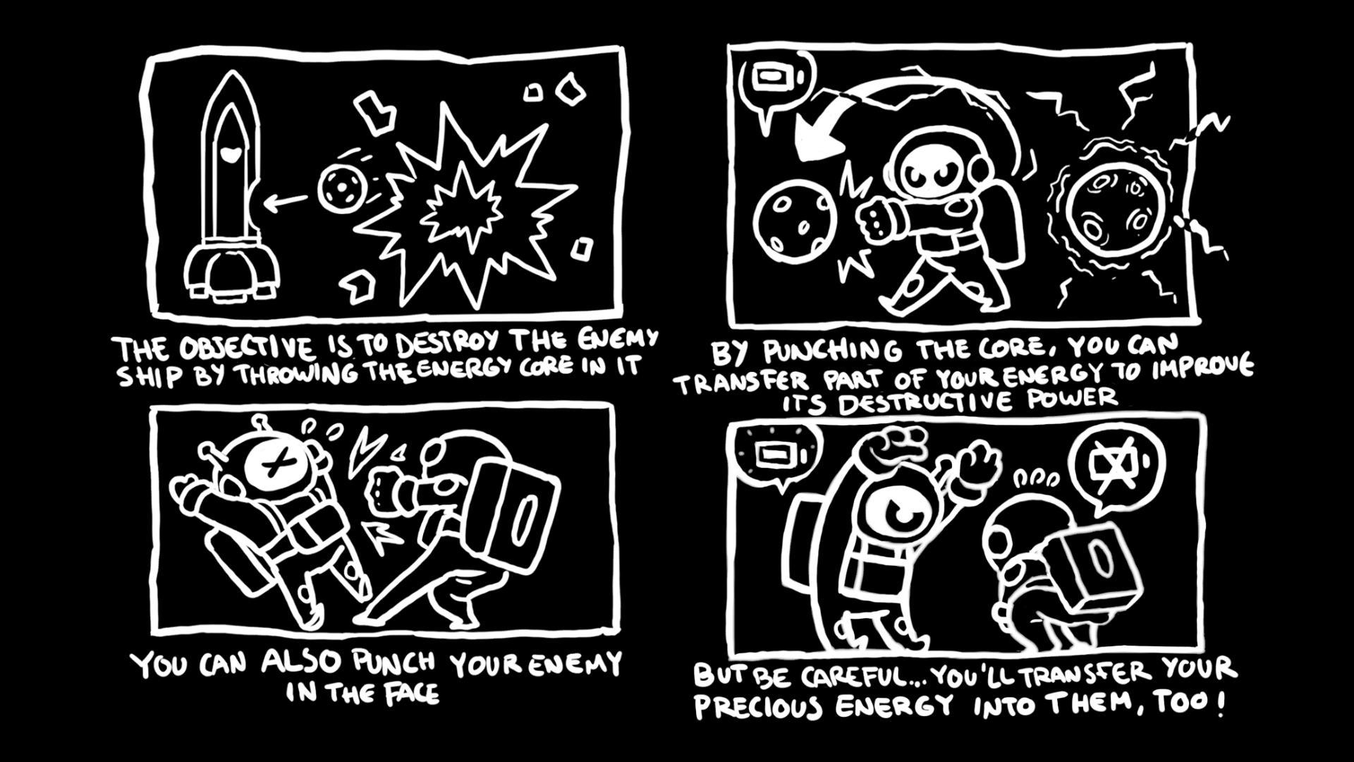Цель состоит в том, чтобы уничтожить вражеский корабль, бросив в него энергетическое ядро. Пробивая ядро, вы можете передать часть своей энергии, чтобы увеличить его разрушительную силу. Вы также можете ударить врага по лицу, но будьте осторожны — вы передадите и ему свою драгоценную энергию!