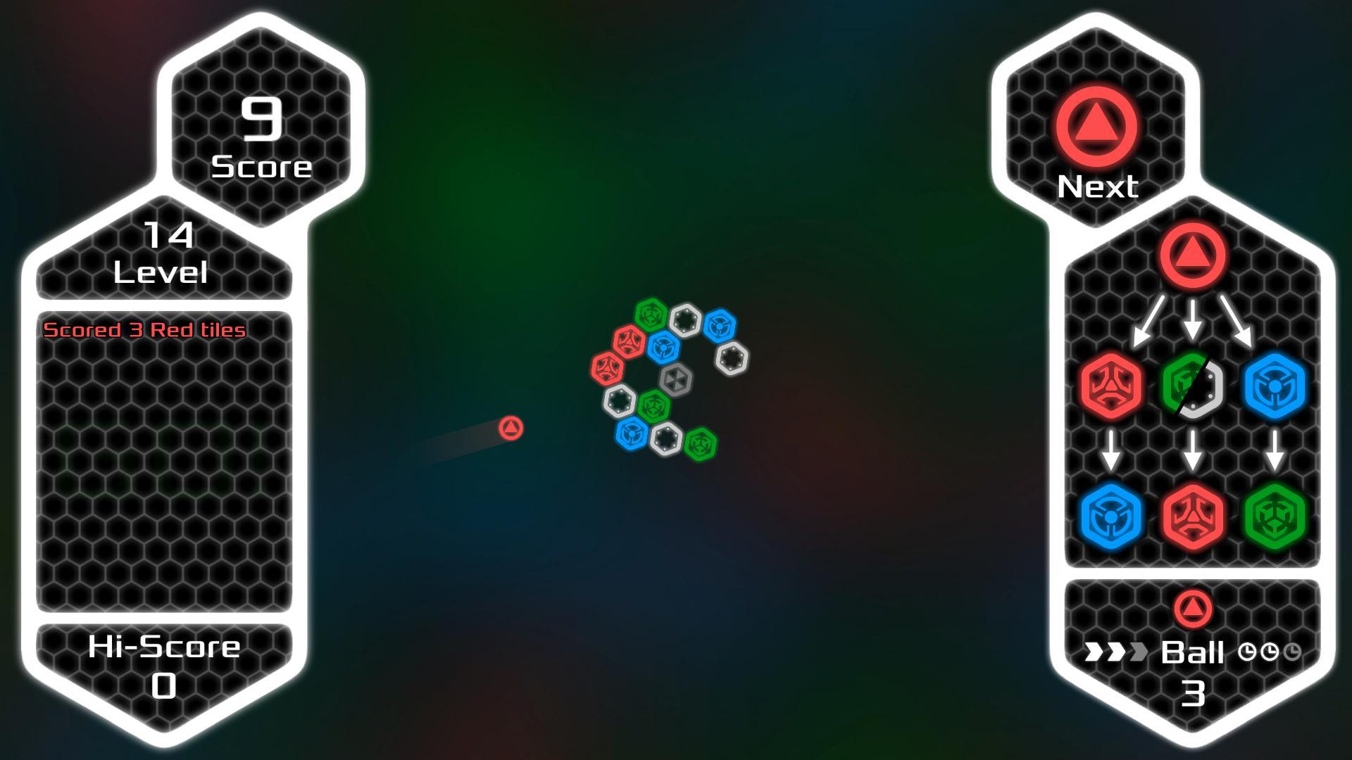 Очистите все шестигранные плитки вокруг основной плитки, чтобы выиграть уровень. Если остались плитки, которые не могут составить группу из 3 или более, или повреждена основная плитка, игра окончена!