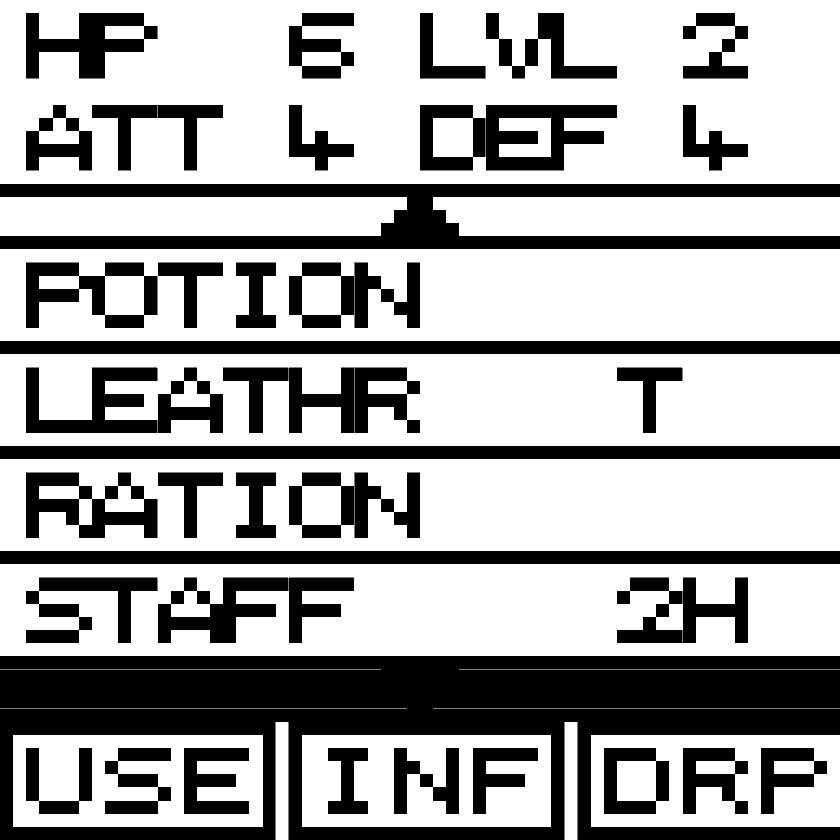На обзорном экране вы можете щелкнуть плитки, прилегающие к вашему персонажу (смайлик), чтобы переместиться туда. Если вы попали на сундук с сокровищами (сундуки), вы можете забрать предмет, нажав на кнопку INT внизу. Если вы доберетесь до лестницы на следующий уровень, нажатие на INT приведет вас на следующий этаж. Ловушки причиняют вам вред, а стены непроходимы. Нажатие на EXM, а затем на плитку даст информацию о том, что там находится. Нажав на STT, вы получите свой инвентарь и свой статус. Вы можете использовать и экипировать предметы, нажав «Использовать», а затем соответствующий предмет. Вы также можете бросать предметы или получать о них дополнительную информацию. Ваша грузоподъемность ограничена, но, как и максимальное здоровье, растет с каждым уровнем, в котором вы погружаетесь глубже.