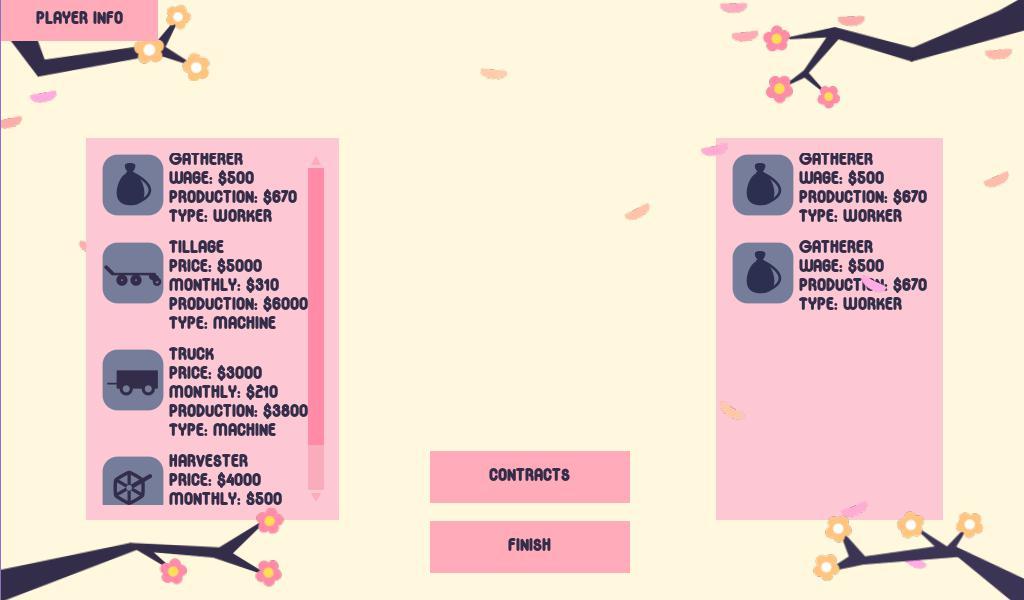 Осень/Урожай: третий и самый важный экран, здесь вы готовите свое поле к производству и пытаетесь выполнить контракты. Я пытался создать механику спроса и предложения, но она работает плохо... так что... нам придется разобраться с этим позже