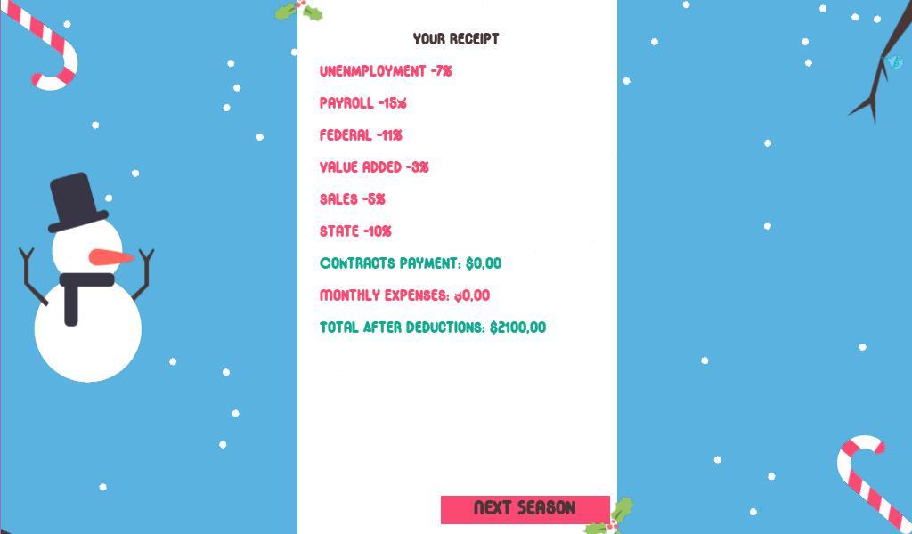 Зима/Квитанция: пассивный экран, здесь больше нечего делать, кроме как смотреть, как ваши деньги крадут налоги, получать платежи по контракту и платить своим работникам. Здесь вы узнаете, сломались ли вы или все еще можете вернуться на рынок.