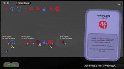 - Разыгрывание заклинания: щелкните левой кнопкой мыши по карте, чтобы выбрать ее для разыгрывания. Вы можете подпитывать это заклинание либо кубиком, либо другой картой того же или более высокого уровня, если вы ранее установили фокус на эту карту в конструкторе колод. Щелкните правой кнопкой мыши, чтобы мгновенно применить его из руки (это можно отключить в настройках — нажмите ESC, чтобы отобразить меню настроек).