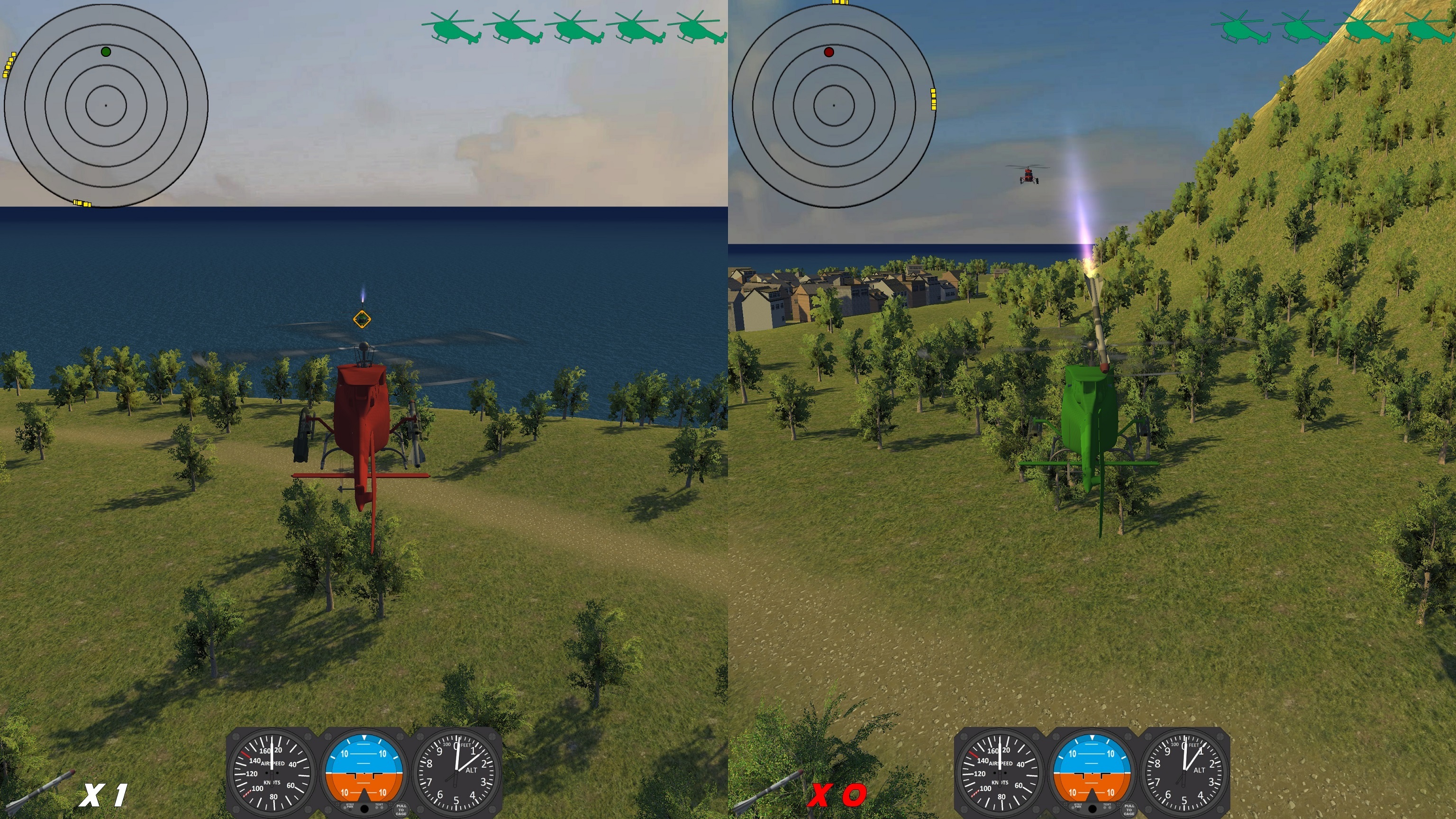 Вы можете участвовать в одиночной гонке или чемпионате (оба режима доступны для 1 или 2 игроков в режиме разделенного экрана), на время в режиме гонки на время или против друга в режиме противостояния. Вы также можете сразиться с другом с единственной целью уничтожить его вертолет!