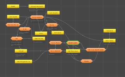 Само повествование представляет собой смесь игрового повествования в стиле «разветвляющихся путей» и «множественных концовок». Согласно заданию, он использует «путешествие героя» и имеет несколько точек принятия решений, которые проводят игрока через разные разделы истории в зависимости от его выбора.