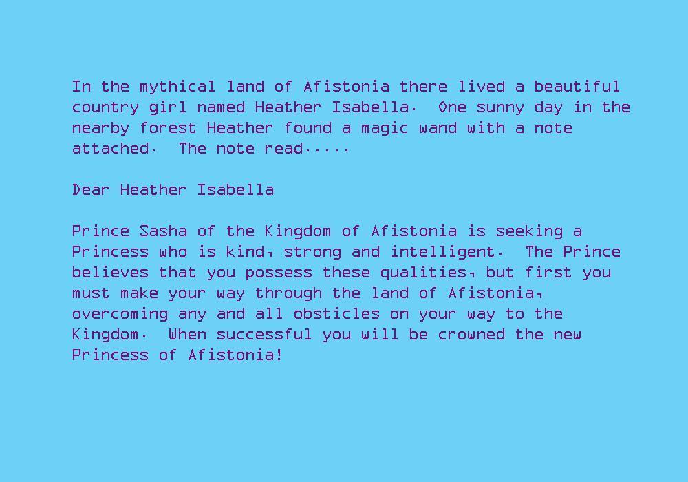 Афистония: Крестьянин to Princess — это образовательная интерактивная сюжетная игра, предназначенная для возрастной группы от 5 до 9 лет, однако родители, старшие братья и сестры или члены большой семьи могут сидеть со своими детьми, помогать им в игровом процессе, читая сказку, содержащуюся в ней. Этот тип игры способствует качественному семейному взаимодействию, а также дает дополнительное удовольствие от современных технологий и ретро-стиля, который многие родители найдут привлекательным и вызывающим ностальгию.