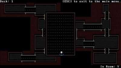 Это мой космический roguelike. Это находится в разработке, поэтому все, что вы можете здесь сделать, это перемещать смайлик с помощью стрелок. Вы можете прыгать с ним по карте с помощью пробела. Используйте «z» или «x», чтобы переключать колоды вверх или вниз. 'b', чтобы "согнуть" пространство (т.е. создать новый корабль). 'esc' возвращает вас в главное меню.