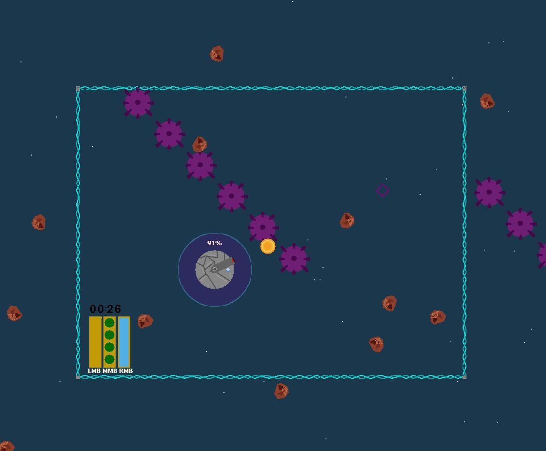Поскольку этот джем побудил нас изучить конструкции двойного назначения, я придумал, как объединить механику движения с другими механиками. Из-за того, что этот джем продлился недолго, я сразу начал с одной из первых идей, которая пришла мне в голову: взаимосвязанная съемка и перемещение. В результате получилась игра, в которой целью стрельбы является не только поражение врагов, но и перемещение вас с помощью отдачи вашего оружия. Поскольку такое поведение может привести к тому, что игрок потеряет контроль над своим движением, я добавил две дополнительные механики, связанные с движением. Один из них — умная бомба.уничтожает всех мелких врагов на экране. В дополнение к этому он также останавливает любой импульс игрока, позволяя ему уберечься от полета в опасную зону. Другая механика — зеркальный щит, который можно довольно свободно размещать на карте. Он отражает астероиды и ваши собственные снаряды для выполнения трюковых ударов, а также отражает игрока, сохраняя при этом его скорость. Используя зеркальный щит, игрок может совершать безопасные повороты на 180°.