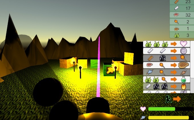 Вы можете нажать на меню крафта в правом среднем углу экрана, чтобы объединить ресурсы в стиле Terraria/Minecraft. Некоторые ресурсы в верхнем правом углу также кликабельны. Так еда вас насытит, лекарства исцелят, а на уровне расставлены факелы, чтобы освещать путь в ночное время. Факелы также используются для приготовления пищи в меню крафта, поэтому хорошо, когда их много! Они сгорят через 15 секунд после размещения.