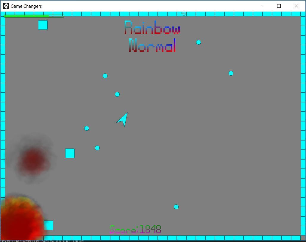Эта игра посвящена переменам. На протяжении всей игры в верхней части экрана будут появляться фразы (например, «Большие пули» и «Радуга»). Они будут определять, как игра будет изменяться на протяжении всей игры. Если у вас есть, например, чейнджер «Двойная скорость», игра пойдет в два раза быстрее (мне кажется, что большинство из них не требуют пояснений). Во время игры будет добавлено больше сменщиков, максимум три.