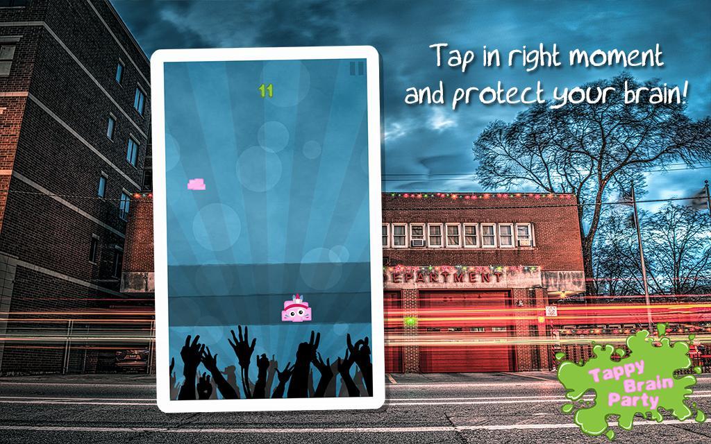 В игре вы становитесь частью зомби партия и ваша главная задача защитить свой мозг. В нужный момент коснитесь заштрихованной области, когда это будет ваш падающий мозг, который вы будете защищать. Место нажатий определяет направление дальнейшего движения и вам нужно его хорошо спланировать! После, на вечеринке начинают появляться различные ловушки, которые вы должны избегать или уничтожать. Медленная или неправильная реакция вашего конца. Чем дольше вы сможете сохранить свой мозг в безопасности, тем больше очков и достижений вы получите.