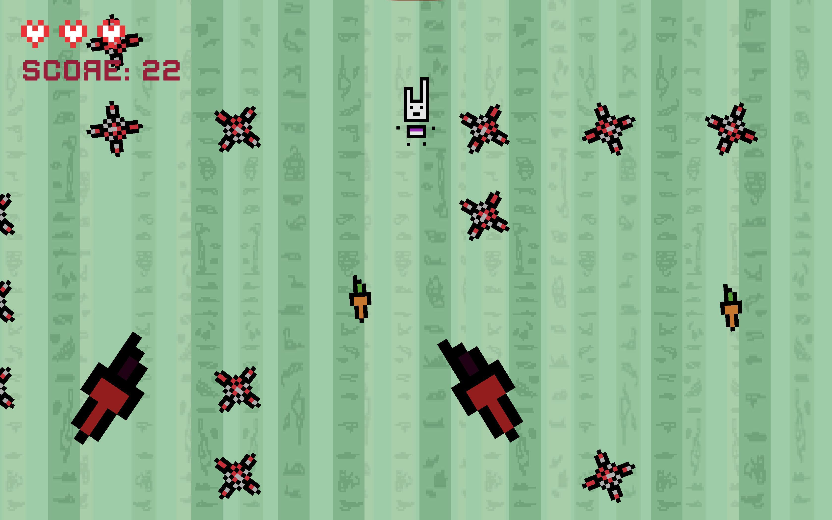 Описание: Наш маленький кролик голоден. Помогите ему съесть морковь, избегая шипов. Благодаря логике видеоигры он может прыгать в воздухе бесконечно. Звучит легко, правда? Ему особенно нравятся большие морковки, и за каждую он дает по 10 очков. Но остерегайтесь вращающихся шипов, которые поранят нашего кролика.----------------------------------------------- -----------------------