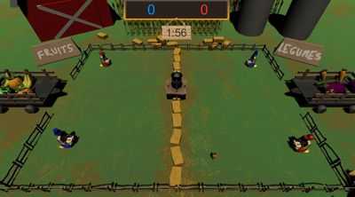 Комментарий игрока : Создана игра для вечеринок (для 4 игроков), разработанная на GameJam (48 часов). 2 экипировки 2 человек, оскорбляющих местность отдельно друг от друга в 2. De chaque coté du terrain se situe 2 charrettes, l'une remplie de fruit l'autre de legumes. Des bégumes et des fruit tombent aléatoirement sur le terrain. Le but est de les lancer dans la charrette соответствует маркировке точек.