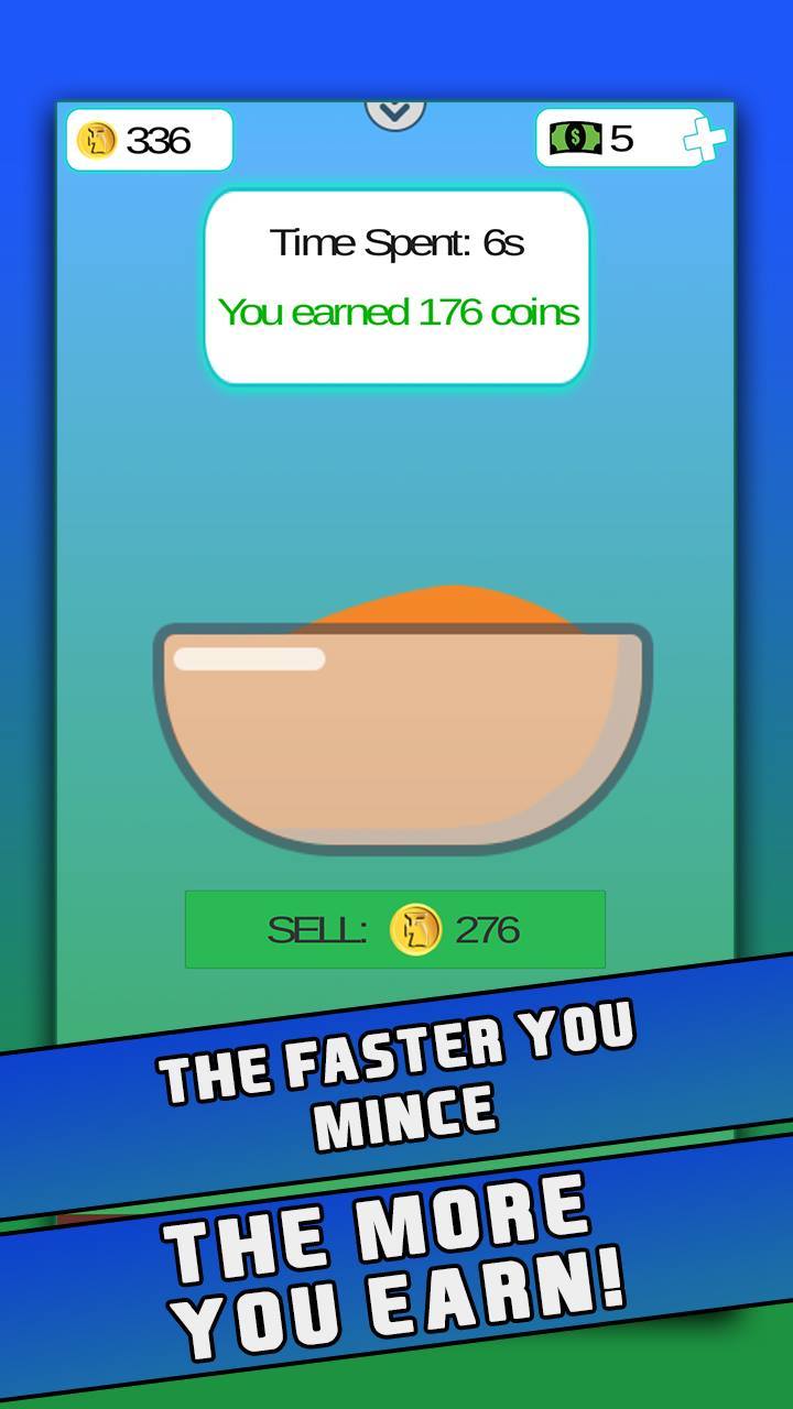 Купите тип мяса и нажимайте на экран, пока фарш не будет готов. Поддерживайте скорость кликов, чтобы зарабатывать больше денег.