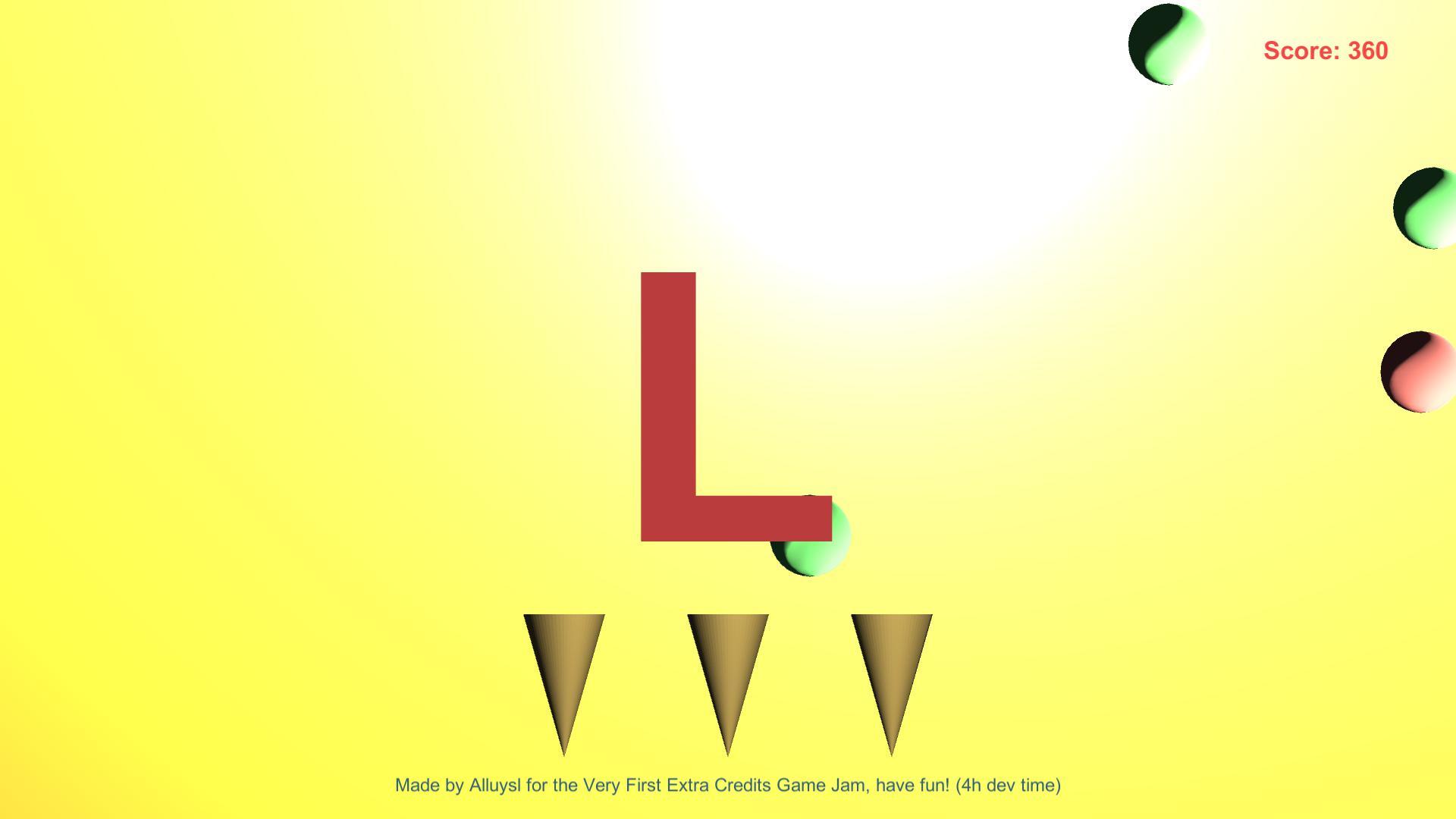 В этой игре, созданной за 4 часа для игры Very First Extra Credits Game Jam, вы управляете тремя рожками мороженого, которые ищут лучшие ассоциации вкусов между синим, зеленым и красным. Однако будьте осторожны, не тратьте мороженое зря, иначе вас накажут большой жирной буквой L и придется начинать заново! Постарайтесь набрать больше очков, используя следующие комбинации: