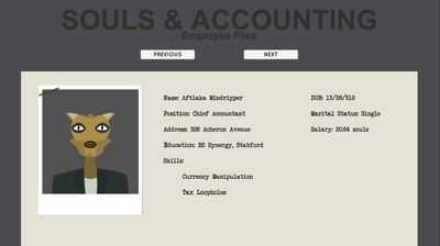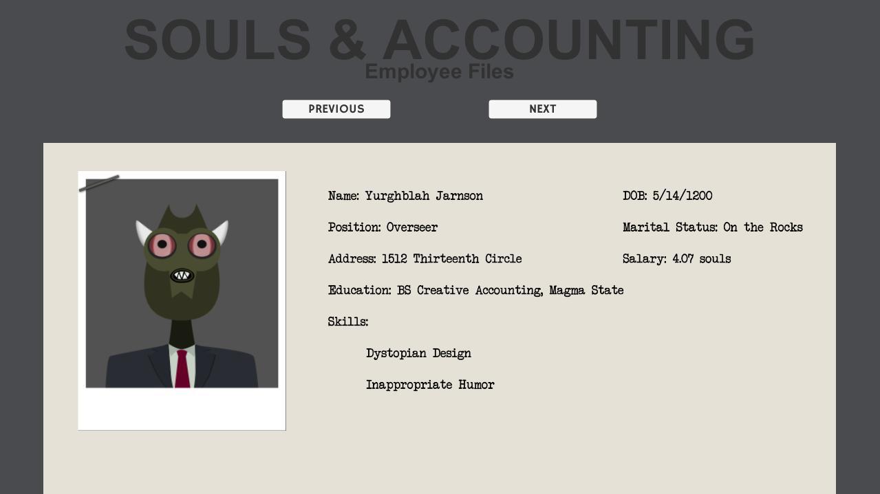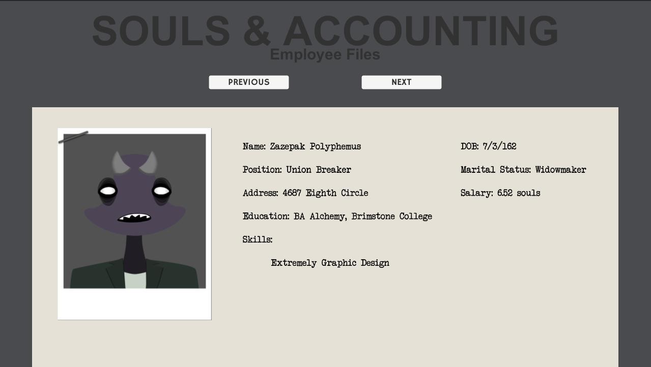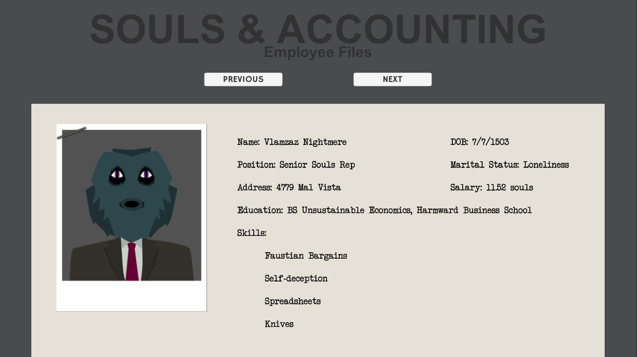Souls & Accounting: файлы сотрудников случайным образом генерирует поляроиды корпоративных демонов вместе с досье их сотрудников. Созданная для Procedural Generation Jam 2015 (#procjam), которая длилась неделю в ноябре, считайте это небольшим доказательством концепции полной демонической игры по корпоративному управлению Souls & Accounting, которая будет разработана компанией Nonadecimal Creative в 2016.