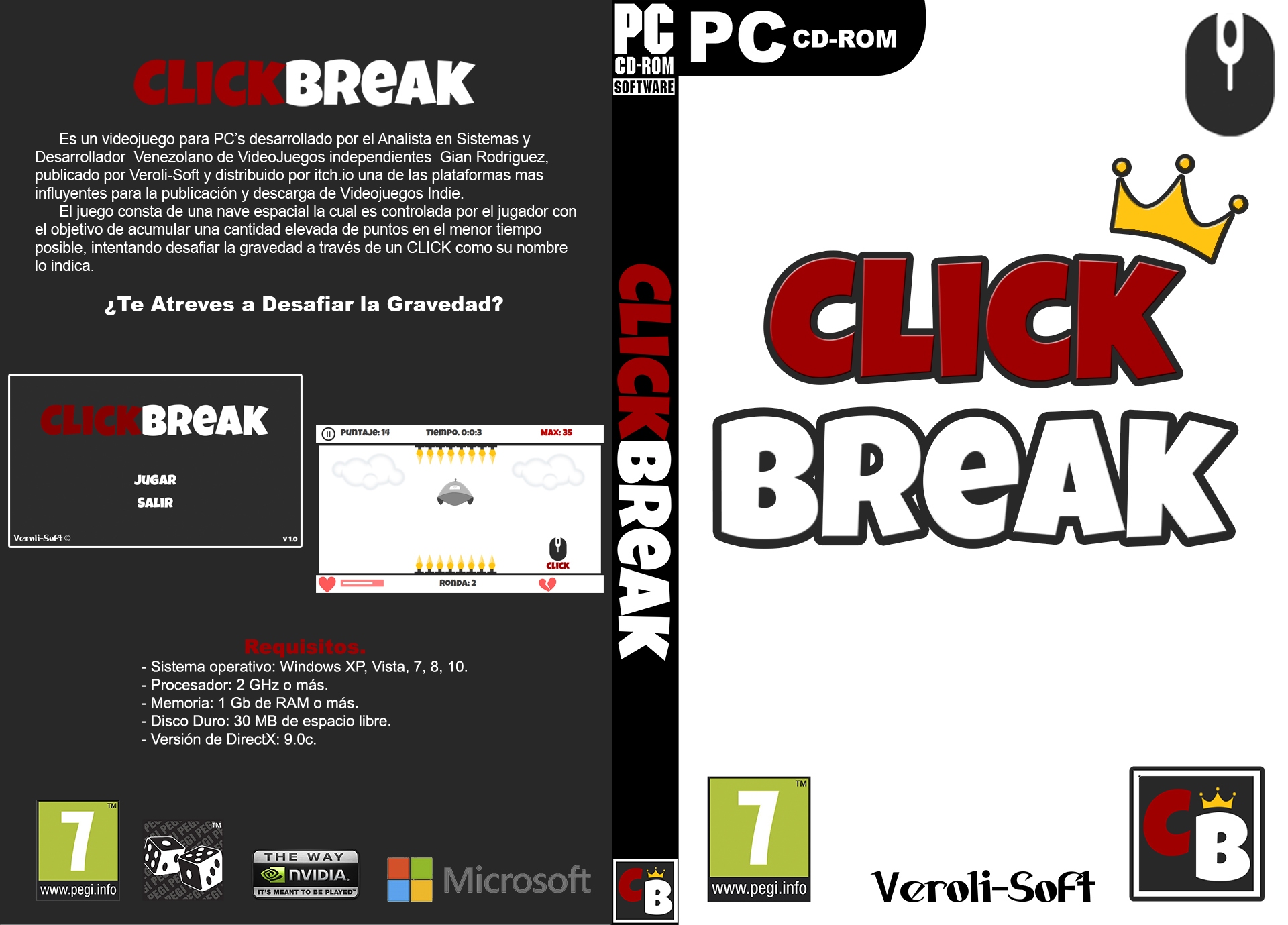 «ClickBreak» создан для ПК, предназначенных для аналитики и систем и устройств , венецианских независимых поставщиков видео, Джана Родригеса. , общедоступный для Veroli-Soft и itch.io на одной из платформ, влияющих на публикации и рассылку Инди видеоигры.