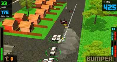 BUMPER — это казуальная игра, созданная на движке Blender Game Engine, в которой игрок должен уничтожить транспортные средства как можно больше, стараясь не попасться полиции, добраться до контрольно-пропускных пунктов, чтобы выиграть время и улучшить свое оружие.