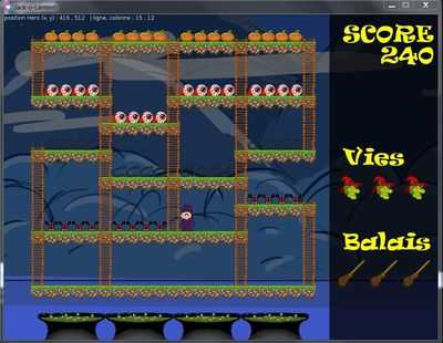 Описание: В волшебном зелье вы воплощаете волшебника, который готовит зелья для Хэллоуина. Pour ce faire, vous devez les faire tomber dans les chaudrons en bas de l'écran en marchant dessus. Chaque ingredient tombera ainsi d'un étage à l'autre jusqu'aux chaudrons.