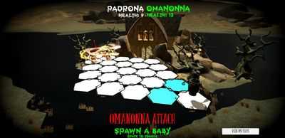 Каждый ход атака переключается между вами и противником. Пока вы находитесь в режиме атаки, постарайтесь перекрыть пешки противника; пока они находятся в режиме атаки, старайтесь избегать их! Каждый ход фиксируйте каждое движение ваших детей, нажимая на одну из зеленых плиток рядом с ними. Пока противник находится в режиме атаки, нажмите пробел, чтобы переключиться в режим появления, где вы можете щелкнуть синюю плитку, чтобы вызвать ребенка за счет 2 единиц здоровья. Пока вы в атаке, нажмите кнопкуПробел и выберите красную плитку, чтобы обрушить разрушительную молниеносную атаку на плитку, на которую, по вашему мнению, переместится враг. Когда Оманонна взаимодействует со своими противниками в диалоге, она делает выбор в пользу других внуков, предоставляя особые способности.