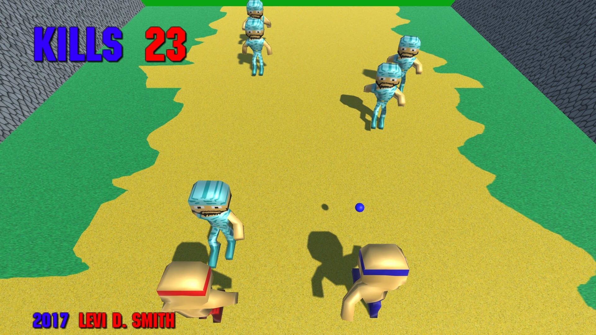 Это была простая игра для проверки концепции, которую я создал примерно за четыре часа, чтобы проверить идею, которая у меня уже давно возникла. Это игра, похожая на классическую Ikari Warriors, но вы можете играть обоими персонажами. В игру лучше всего играть с помощью контроллера XBox, но подойдет любой контроллер с двумя джойстиками. Левый джойстик управляет красным коммандос, а правый джойстик — синим коммандос. Левая кнопка бампера заставляет красного коммандос стрелять, а правая кнопка бампера заставляет синего коммандос стрелять. Поскольку два коммандос работают как одна команда, я почувствовал, что это соответствует теме игрового джема. В игру также можно играть вдвоем, используя альтернативное управление с клавиатуры.