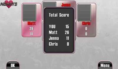 Цель Hearts — набрать наименьшее количество очков в конце игры. Вы должны разыграть карту одной масти (трефы). Если у вас ее нет, вы можете разыграть любую карту, за исключением того, что вы не можете разыграть Черву или Пиковую даму в первый ход, что также называется «трюком». Человек, который разыгрывает старшую карту той же масти, что и ведущая карта, «берет взятку» и ведет следующую взятку. Игрок, взявший взятку, получает 1 очко за каждую черву в этой взятке и 13 очков за пиковую даму. Но если кто-то выиграет все червы и пиковую даму, также называемую «Стрельба по луне», то этот человек получает 0 очков, а каждый другой игрок — 26 очков! Игра заканчивается после того, как любой игрок наберет 100 или более очков!