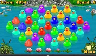 Помощь! С фабрики сбежали полчища злых резиновых уточек! Они хотят захватить наши пруды, озера и болота! Они должны быть остановлены! Резиновые уточки одного цвета исчезнут, если вы разместите их рядами.
