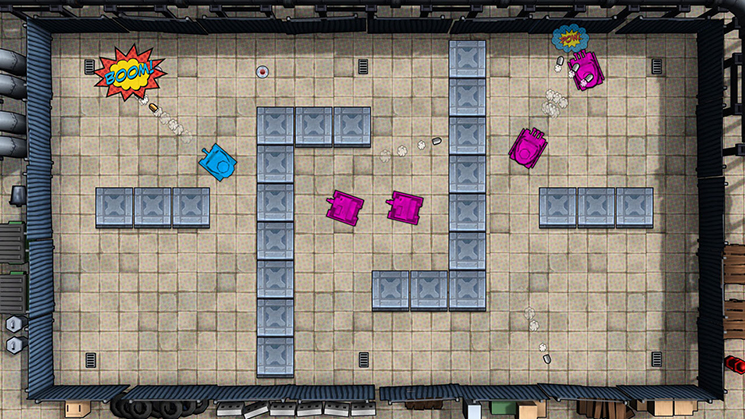 Toon Tanks — это простой, но сложный шутер с видом сверху. исключительно для Wii U™. Цель Toon Tanks — уничтожить каждого врага. танки на каждом уровне. Когда вы взорвали последний, вы можете перейти к следующему уровень с более сильными врагами. В этой игре 80 уровней в четырех другой мир и 6 типов врагов. Веселиться!