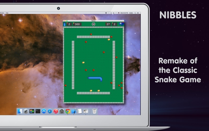 Ремейк классной игры Nibbles (Змейка). Управляйте змеей, чтобы поглощать предметы на своем пути. Цель игры состоит в том, чтобы собирать яблоки, чтобы продвигаться по уровням. Собирайте сундуки, чтобы заработать дополнительные очки.