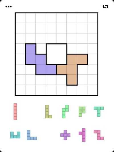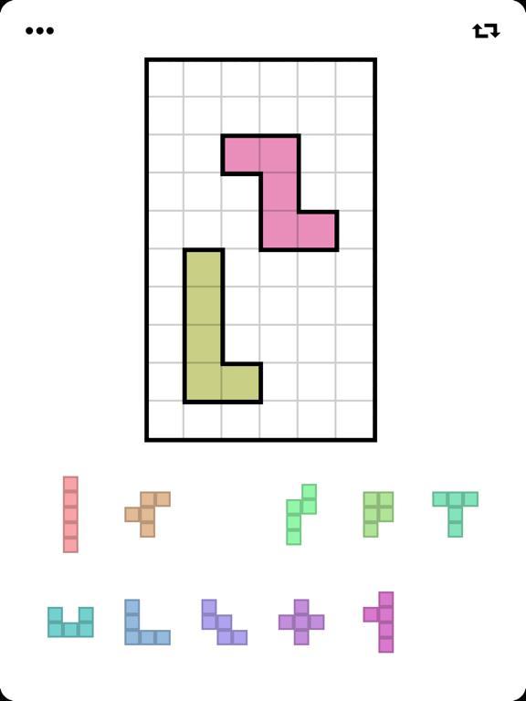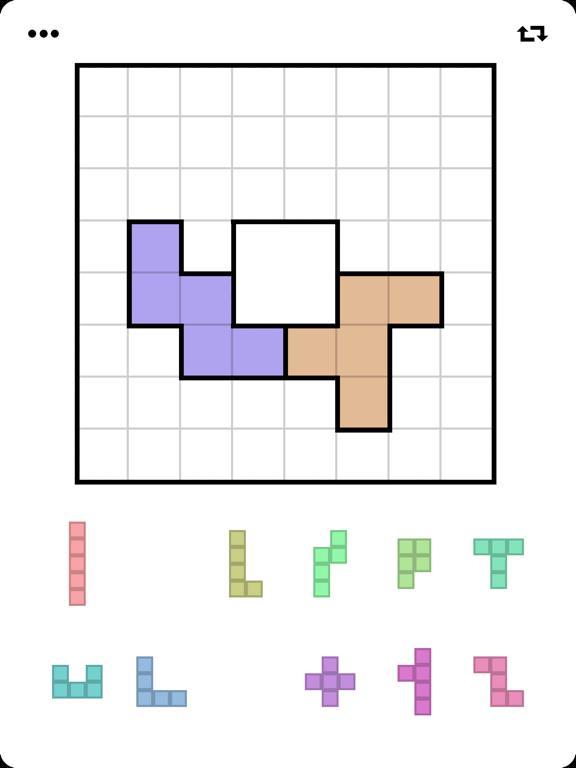 Цель состоит в том, чтобы заполнить доску 12 предоставленными блоками, которые можно вращать и отражать.