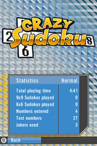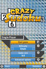 Crazy Sudoku: играйте в судоку на ходу и в любом месте на своем Система Нинтендо DSi. В игре представлено пять различных уровней сложность — задача для новичков и профессионалов судоку! Выбери из два разных размера сетки (9x9 или 6x6)! С удобной функцией Note вы может добавлять комментарии к каждой ячейке и решать даже самые сложные головоломки судоку! Или попробуйте бросить вызов другу с блестящими двумя режим игрока!