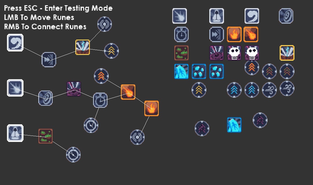 Это своего рода пробная игра, которую мы сделали для геймджема Jamcraft2. Наша идея заключалась в том, чтобы создать систему, позволяющую игрокам создавать заклинания из рун самыми разными способами. Вы можете комбинировать руны разных типов и модификаторы рун, чтобы создавать заклинания, убивающие слаймов множеством разных способов, включая, но не ограничиваясь...