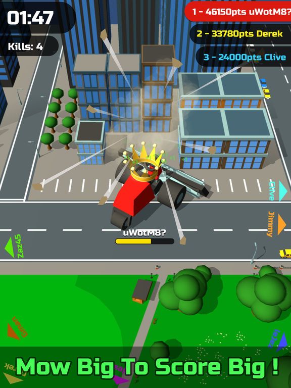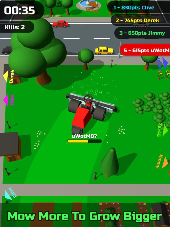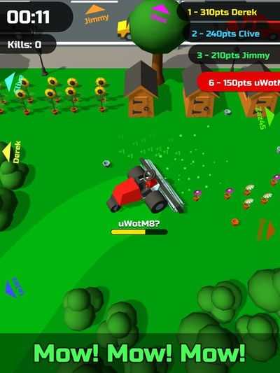 Примите участие в гонке, чтобы косить все, что попадется вам на глаза: траву, цветы, скамейки в парке...навесы...деревья...автомобили...небоскребы ...ВСЕ - честная игра, даже другие косилки!!