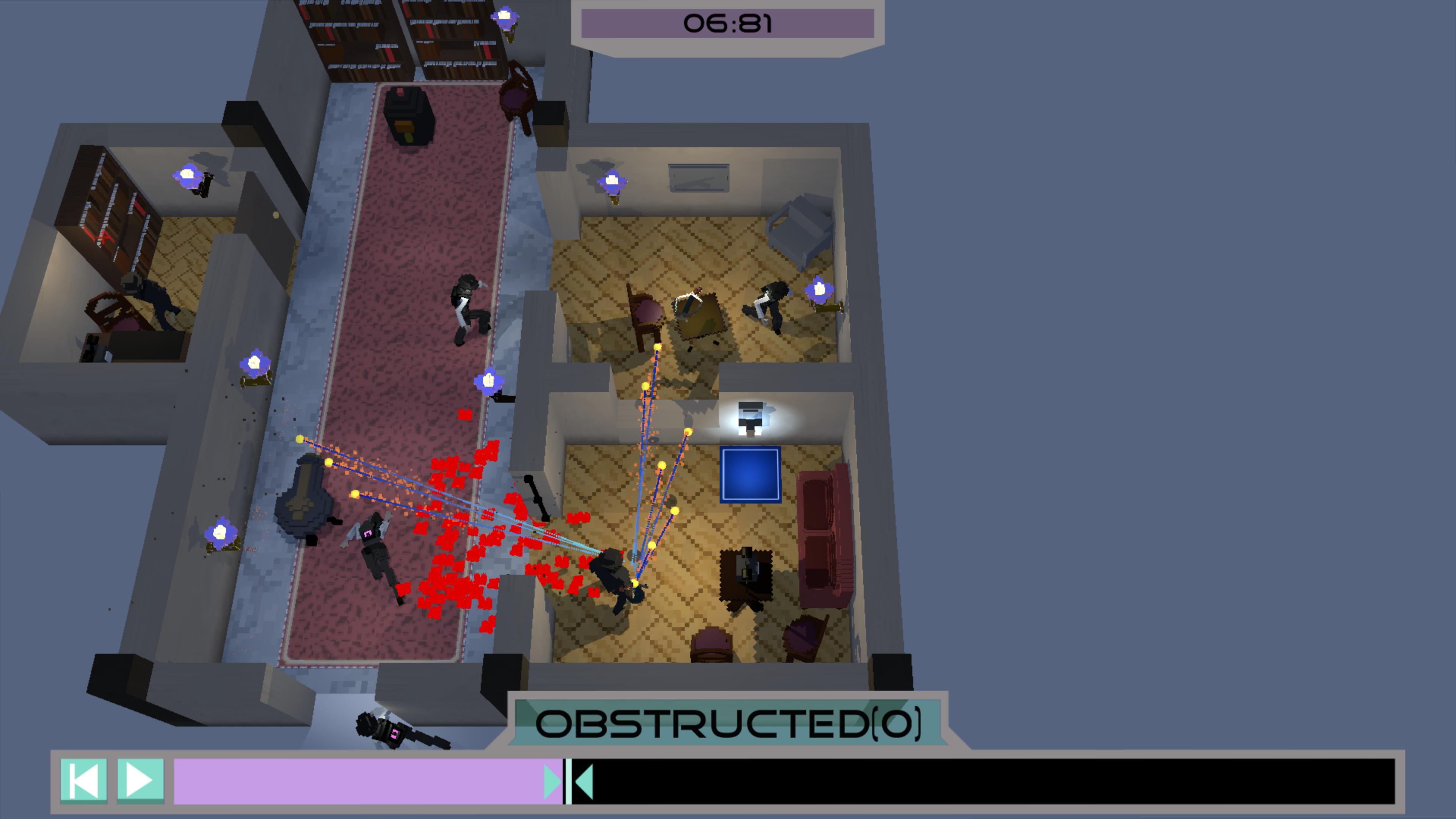 Управление: WASD для перемещения. E, чтобы подобрать оружие. F — бросить удерживаемое оружие. R, чтобы перезапустить. ПРОБЕЛ ВРЕМЯ ПАУЗЫ/ВОЗОБНОВЛЕНИЯ ПАУЗЫ. ESCAPE меню паузы.