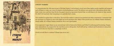Cragne Manor — это текстовое приключение, посвящённое двадцатилетнему юбилею книги Майкла Джентри Anchorhead . Это также грандиозная и нелепая экспериментальная совместная работа.