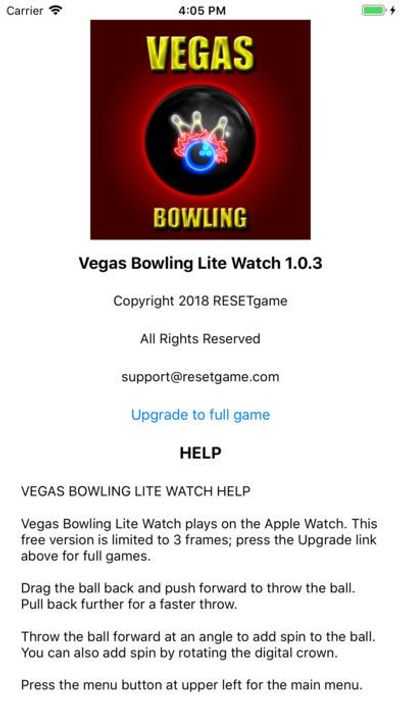 Примечание. Игра Vegas Bowling Lite Watch воспроизводится на Apple Watch. Эта бесплатная версия поддерживает сокращенные игры с тремя кадрами; обновитесь до полной версии для 10-кадровых игр.