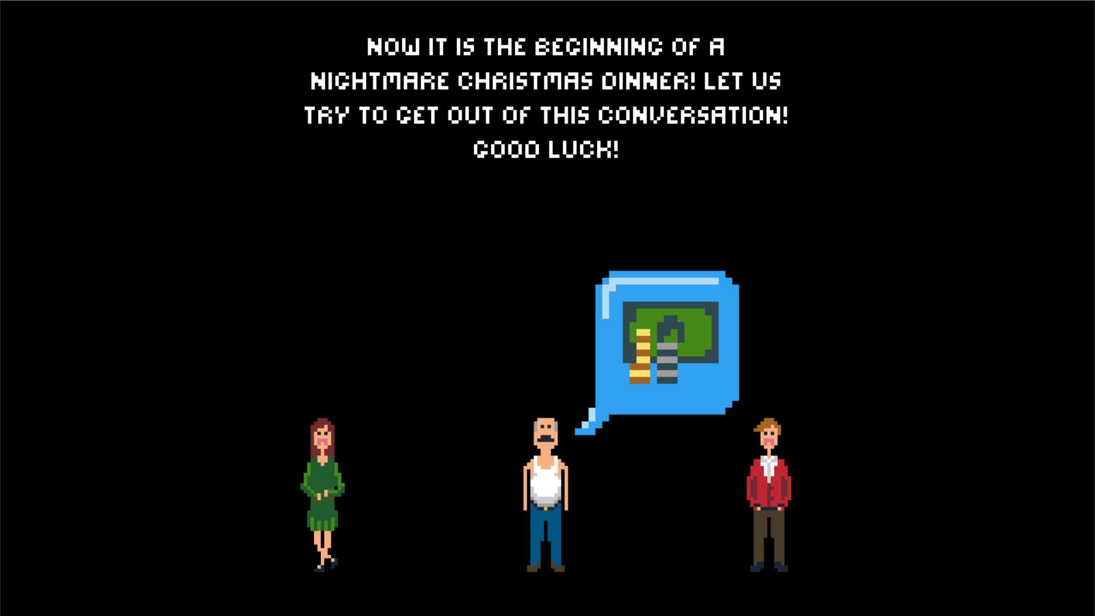 Пережить неловкий рождественский семейный ужин, избегая неудобных и вызывающих разногласия тем для разговора. Проплывите через 4 этапа или играйте в бесконечном режиме, собирая удобные предлоги, чтобы избежать дальнейшего разговора с вашими родственниками. Не затрагивайте слишком много этих горячих тем, иначе они вызовут разглагольствования и бред и испортят Рождество для всех. Вы все еще любите их, просто хотите оказаться где-нибудь еще.