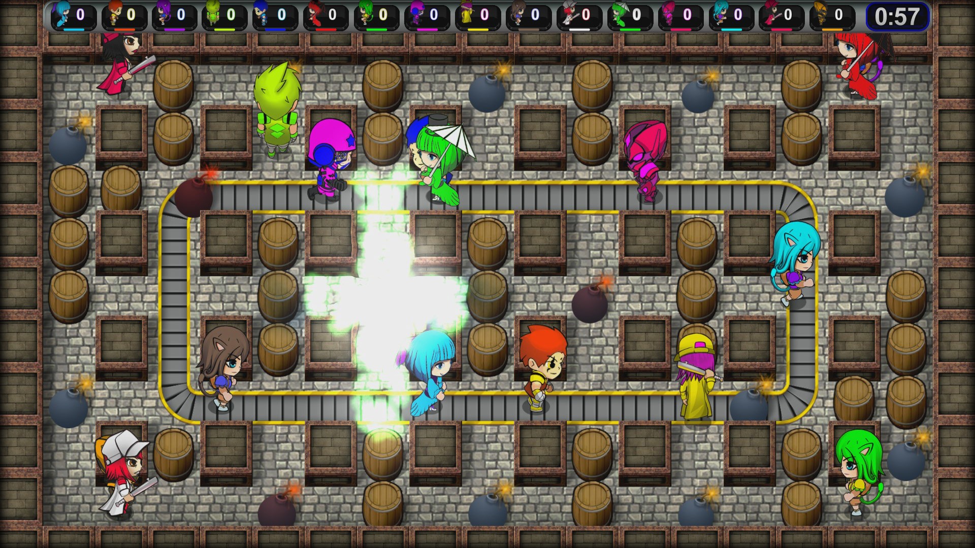 Классический соревновательный геймплей таких игр, как Bomberman, перенесен в современную эпоху. Размещайте бомбы, уходите с дороги, уничтожайте своих друзей, собирайте бонусы, проложите себе путь к победе в различных игровых режимах, адаптированных для плавной многопользовательской игры с практически неограниченным количеством локальных игроков!