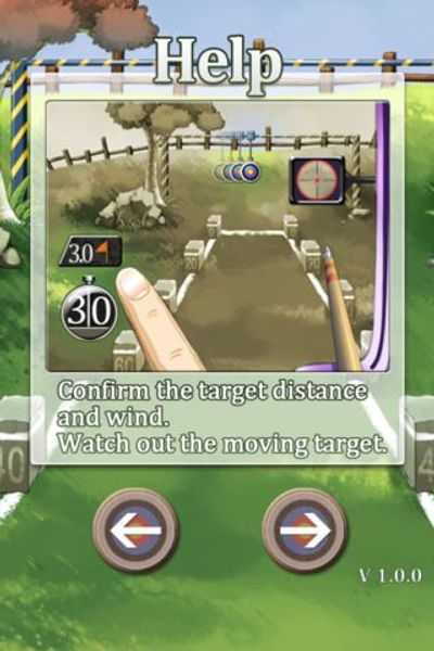 Натяните лук. Направьте стрелу на цель, перемещая руку по экрану. Подтвердите целевое расстояние и ветер. Следите за движущейся целью. Уберите палец, чтобы выстрелить стрелой.