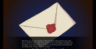 Викторина «Тайна убийства», созданная для NaNoRenO 2019. Присоединяйтесь к 5 другим гостям, чтобы провести ночь веселья и тайн. После того, как старый друг ни с того ни с сего отправляет вам приглашение на вечеринку, вы снова оказываетесь в знакомом месте, но на этот раз к вам присоединяются еще пять гостей, у каждого из которых есть свои причины прийти.