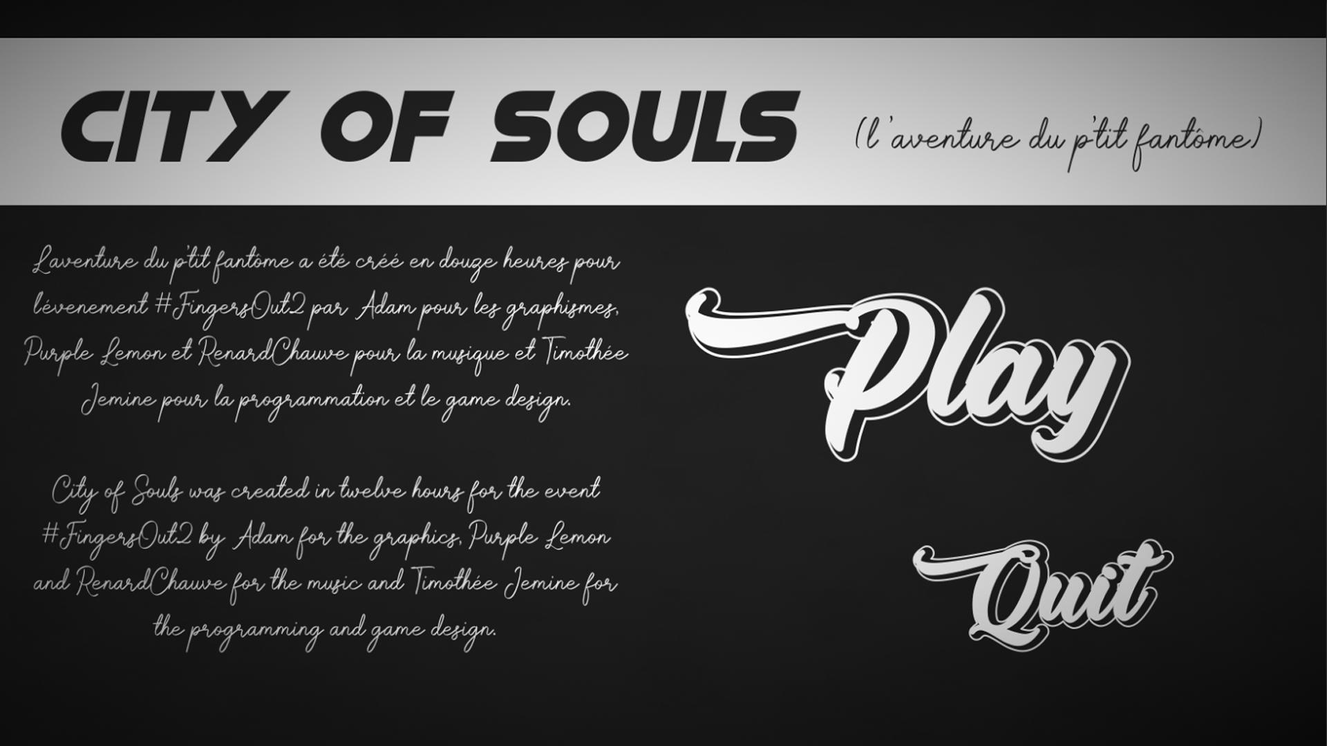City of Souls был создан за двенадцать часов для мероприятия #FingersOut2 Адамом за графику, Purple Lemon, Renard Chauve, другими композиторами мероприятия за музыку и Тимоти Джемином за программирование и игровой дизайн.