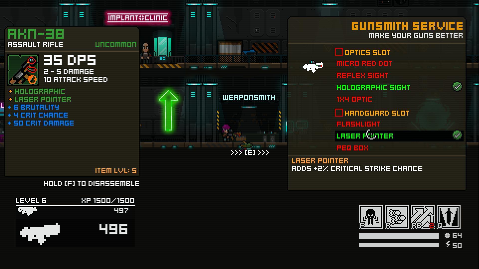 Вместо использования процедурно генерируемого оружия (что и было первоначальным намерением), я решил реализовать полную настройку оружия, как вы, возможно, знаете из больших игр, и позволить игрокам создавать оружие, которое они хотят, вместо того, чтобы заставлять игрока ждать выпадения очень редкого предмета. . К некоторым орудиям (ну, к любому оружию, если у вас правильная репутация и определенное количество валюты) можно прикрепить различные аксессуары и применить атрибуты, которых вам не хватает или которые необходимы для легкого запуска сборки.