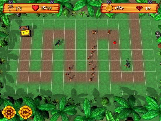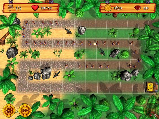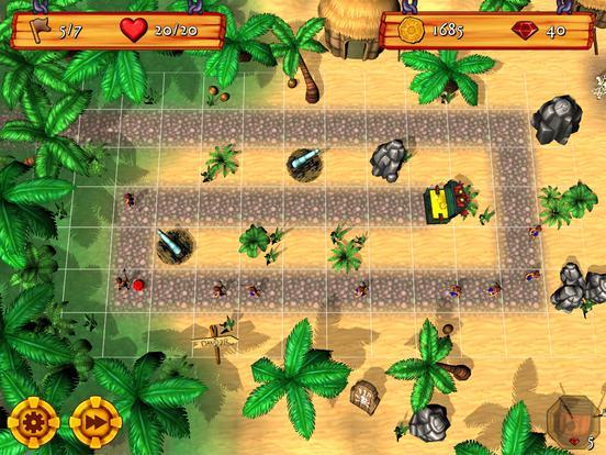 Из павших пиратов время от времени выпадают драгоценные камни, которые вы можете собирать, нажав на них. Драгоценные камни можно потратить на полезные предметы, такие как пороховая бочка, которая разносит пехотинцев вдребезги, барабан вуду, превращающий пехотинцев в неуклюжих зомби, или дымовую шашку, скрывающую ваши пушки от взглядов врага! Просто коснитесь плитки пути, чтобы развернуть предмет в любой момент уровня. Вы также можете в любой момент нажать кнопку перемотки вперед, чтобы ускорить действие.