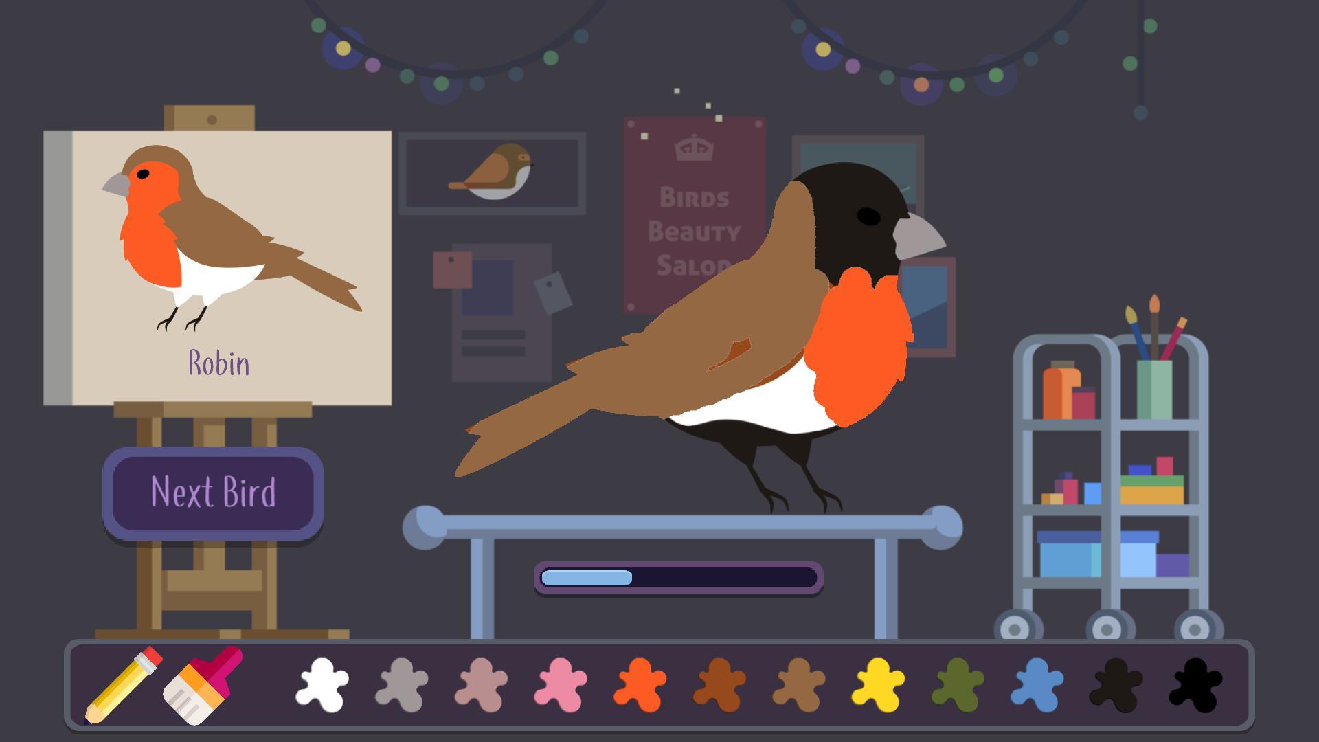 Добро пожаловать в салон красоты Birds. Здесь вы будете использовать свои кисти и краски, чтобы помочь птицам стать такими, какими они хотят, хотя они никогда не стоят на месте.