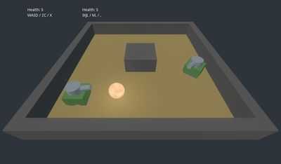 Это прототип игры на танковой арене. От 2 до 4 игроков могут сражаться на различных картах, стреляя друг в друга снарядами, которые отскакивают от стен.